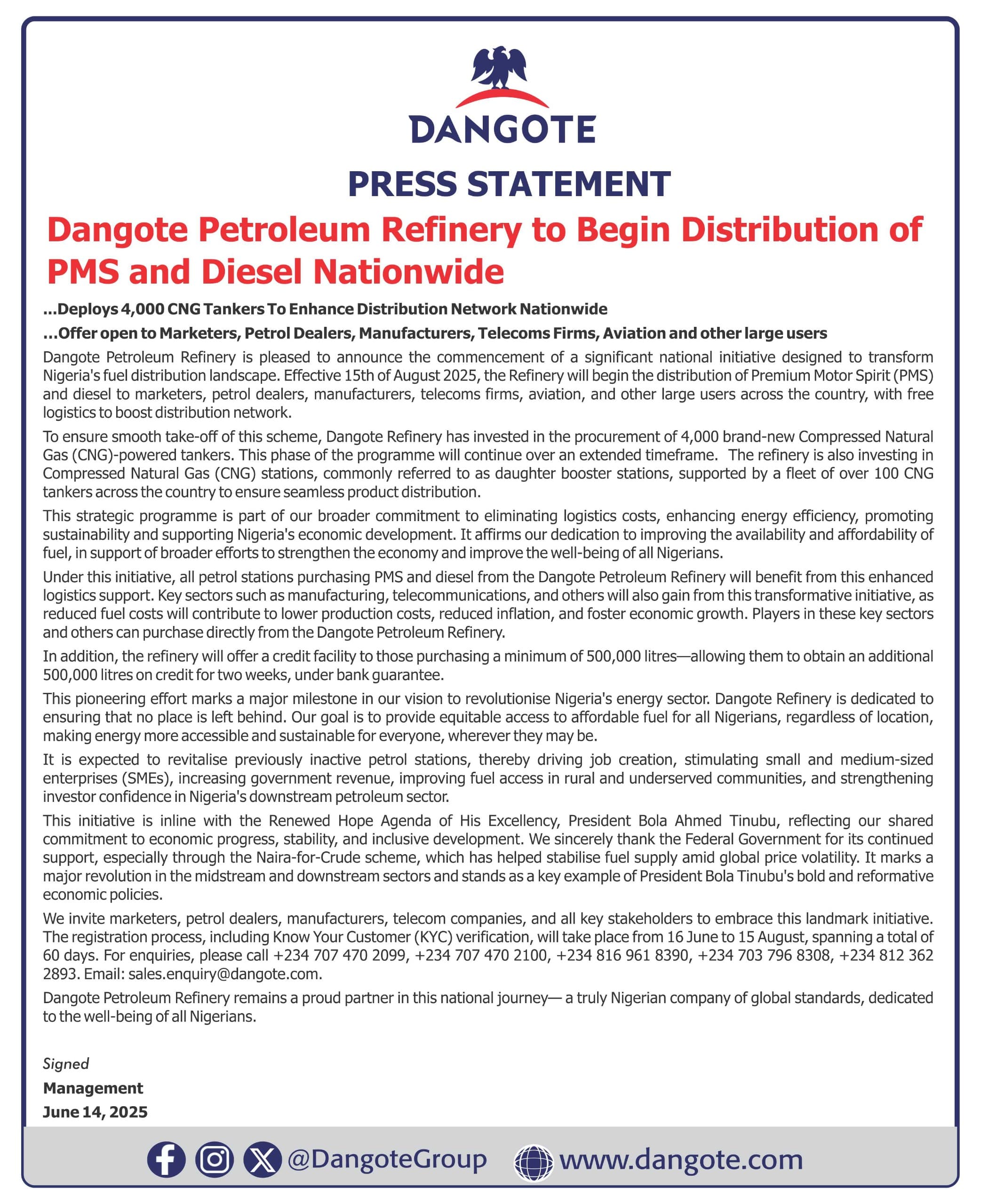 DANGOTE PETROLEUM REFINERY TO BEGIN DISTRIBUTION OF PMS AND DIESEL NATIONWIDE…